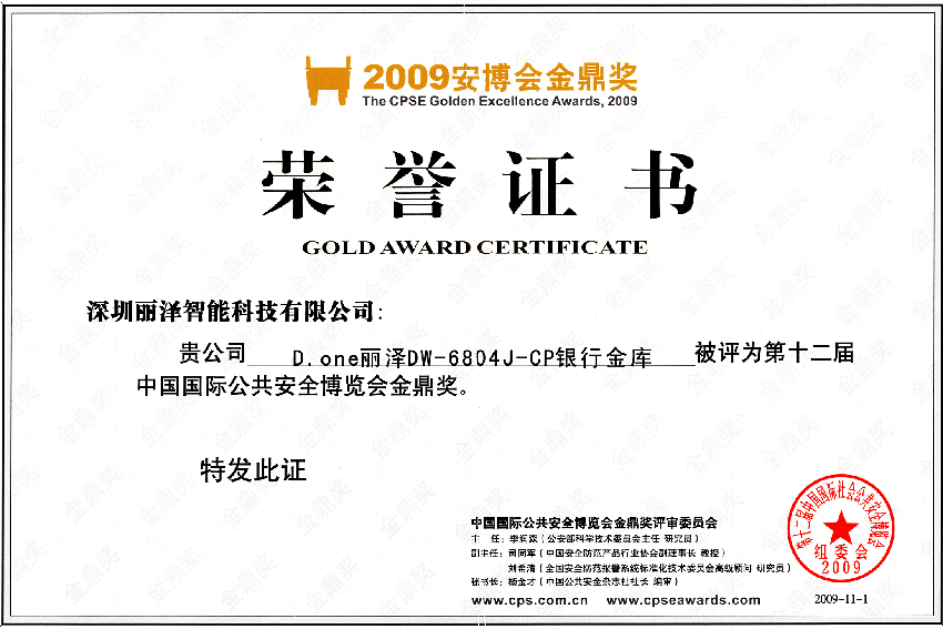 中国国际安博会金鼎奖证书
